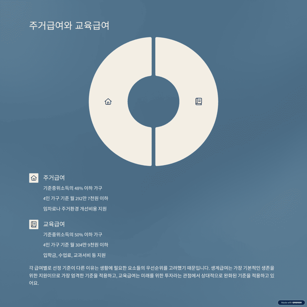 - 주거급여: 기준중위소득의 48% 이하 가구에게 주거비를 지원해요. 4인 가구 기준으로 월 292만 7천원 이하 소득 가구가 대상이며, 임차료나 주거환경 개선비용을 지원받을 수 있어요.