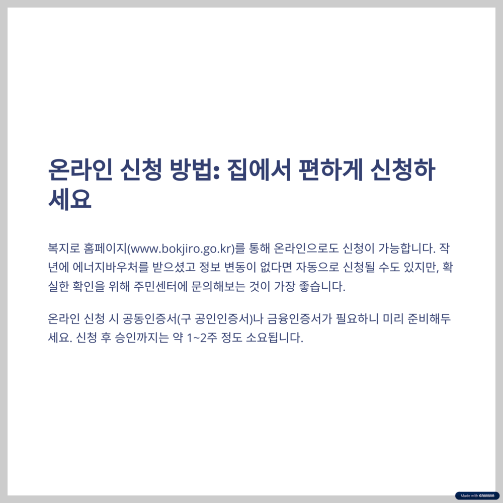 이 포스팅이 안내하는 대로만 따라오시면, 소중한 우리 가족의 여름은 시원하게, 겨울은 따뜻하게 보낼 수 있는 에너지바우처 혜택을 절대 놓치지 않으실 거랍니다!