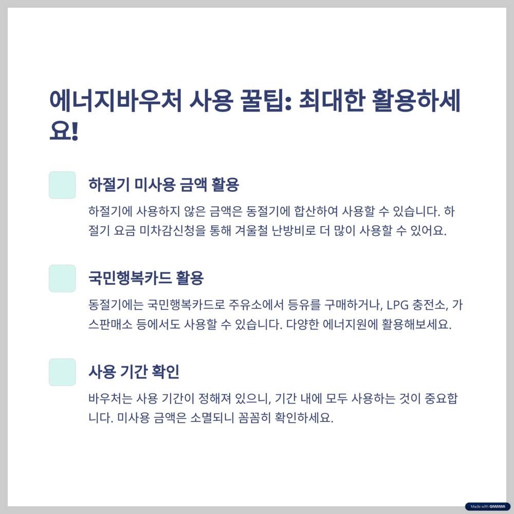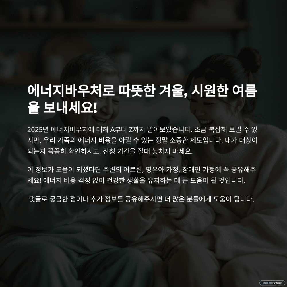 오늘은 2025년 에너지바우처에 대해 정말 A부터 Z까지 알아보았어요. 조금 복잡해 보일 수 있지만, 우리 가족의 에너지 비용을 아낄 수 있는 정말 소중한 제도랍니다. 내가 대상이 되는지 꼼꼼히 확인하시고, 신청 기간을 절대 놓치지 마세요.