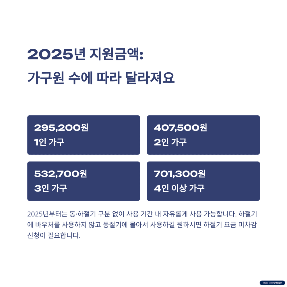 지원금액은 가구원 수에 따라 달라져요. 2025년 부터는 지원금액이 동.하절기 구분없이 사용기간 내 자유롭게 사용이 가능하기 때문에 하절기에 바우처를 사용하지 않고, 동절기에 몰아서 사용하기를 희망하는 경우에는 하절기 요금 미차감신청이 필요하니 참고하시기 바래요.