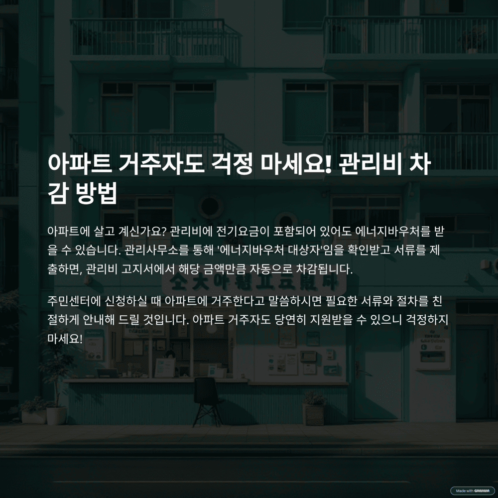 걱정 마세요! 아파트 거주자도 당연히 지원받을 수 있답니다. 주민센터에 신청하실 때 아파트에 거주한다고 말씀하시면 친절하게 안내해 주실 거예요.