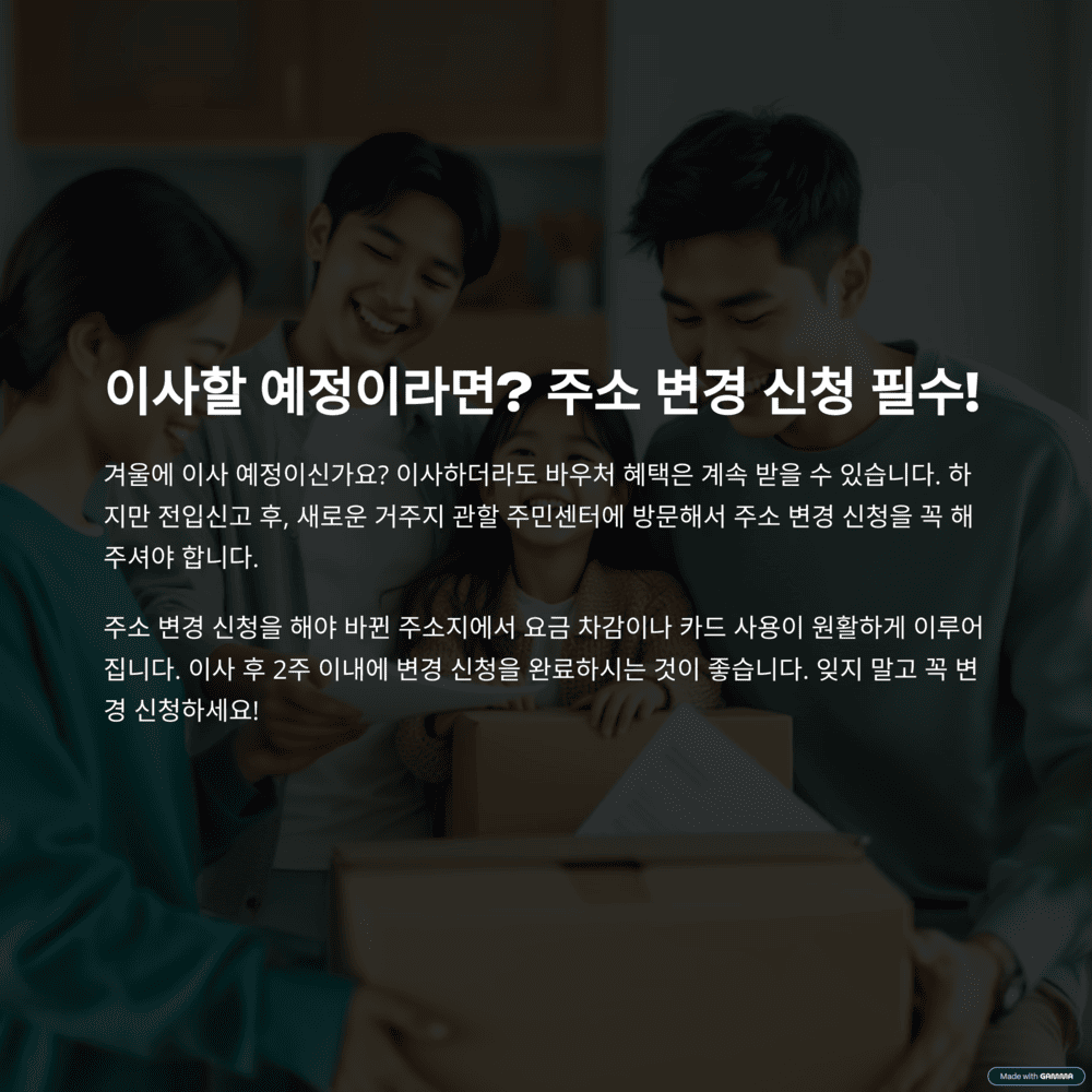 그래야 바뀐 주소지에서 요금 차감이나 카드 사용이 원활하게 이루어진답니다. 잊지 말고 꼭 변경 신청하세요!