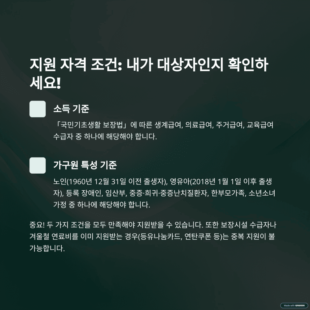 ※ 중요! 만약 우리 집이 모든 가구원이 보장시설 수급자이거나, 겨울철 연료비를 이미 지원받는 경우(등유나눔카드, 연탄쿠폰 등)에는 중복 지원이 불가능하니 꼭 참고하세요!