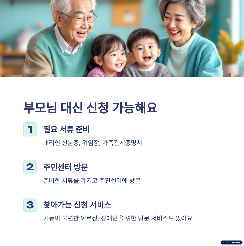 - 찾아가는 신청: 거동이 불편한 어르신이나 장애인을 위해 공무원이 직접 방문하는 '찾아가는 신청' 서비스도 있으니, 주민센터에 문의해보세요.