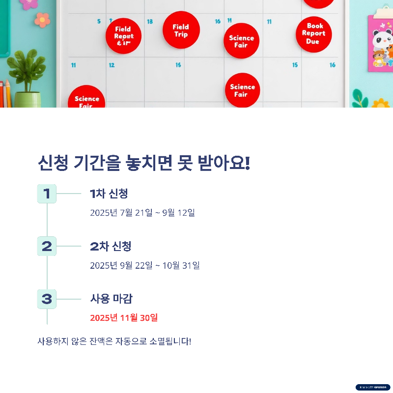 - 1차 신청: 2025년 7월 21일 (월) ~ 9월 12일 (금) 까지