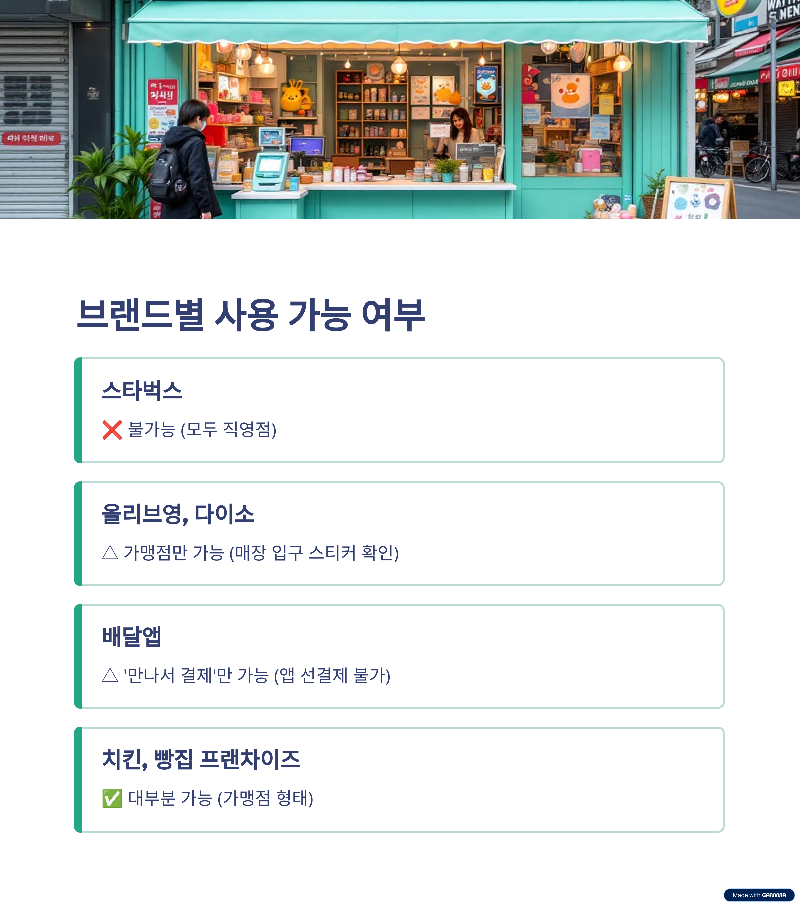 ※ 매장별 스티커 또는 직원 확인 필수 - 편의점 가맹점: CU, GS25, 세븐일레븐 등 모든 **가맹점** 사용 가능(O)