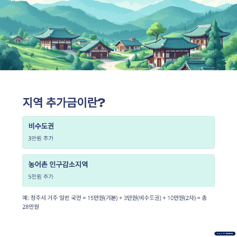 비수도권에 거주하시면 3만원, 농어촌 인구감소지역에 사시면 5만원이 1차 지급 때 추가됩니다. 예를 들어, 청주시에 거주하는 일반 국민이라면 15만원(기본) + 3만원(비수도권) + 10만원(2차) = 총 28만원을 받게 됩니다.