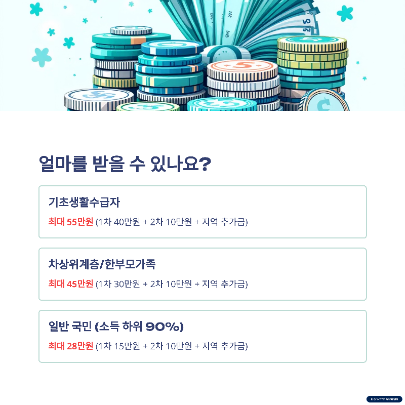 - 일반 국민 (소득 하위 90%): 최대 28만원 (1차 15만원 + 2차 10만원 + 지역 추가금)