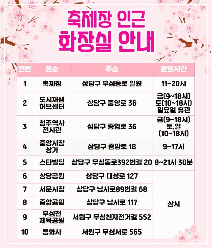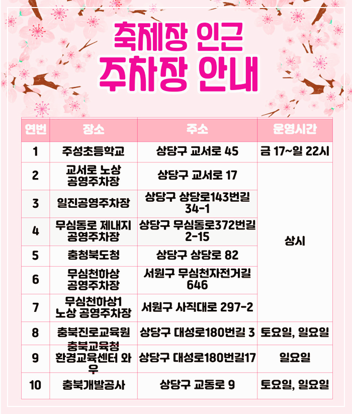 이번 봄, 청주 푸드트럭 축제에서 벚꽃과 함께 맛있는 음식과 다양한 문화를 즐겨보세요! 여러분의 많은 방문을 기다립니다.
