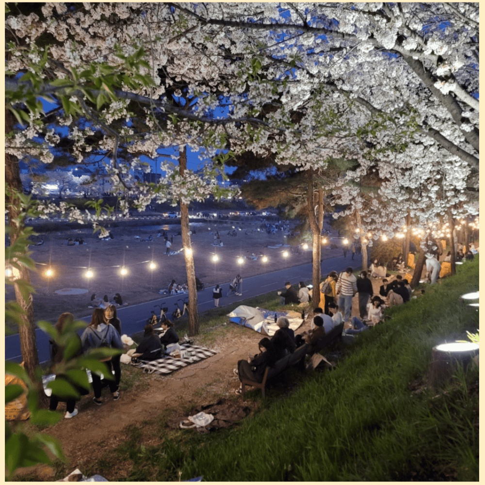 "벚꽃과 푸드트럭 음식의 조합이 정말 최고였어요! 밤에는 조명 덕분에 분위기가 더욱 좋았어요."