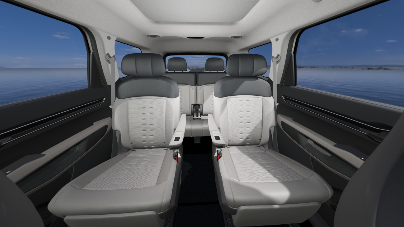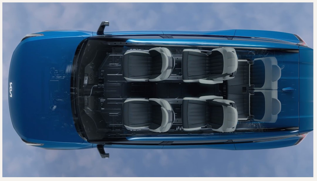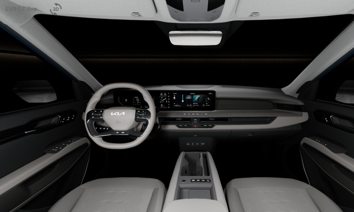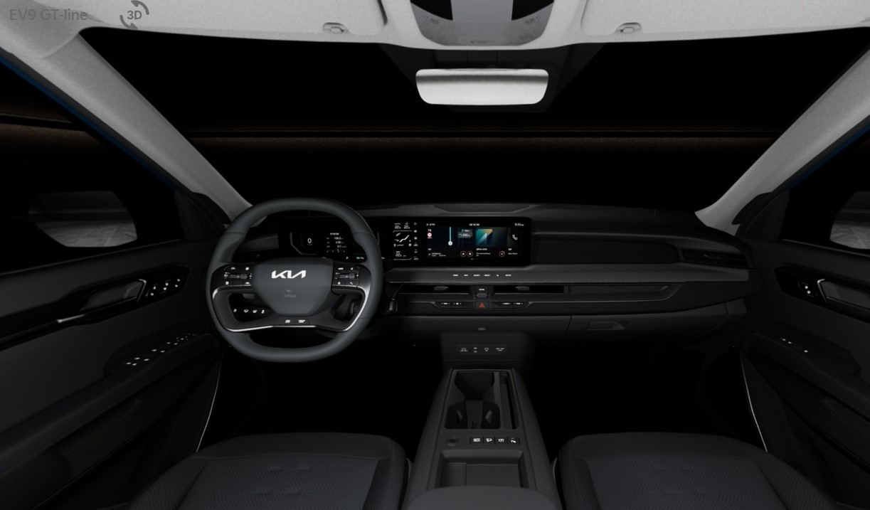 EV9의 내부는 크롬 소재의 사용을 줄이고 탑승자의 손이 닿는 부분에 부드러운 소재를 적용해서 안락함을 주도록 하였습니다. 또한 시동 버튼이 통합된 SBW와 히든 타입 터치 버튼을 적용해서 조작성을 확보하였습니다. 1열의 시트에는 2열 탑승자의 시각적 개방감을 높이기 위해 메시 소재를 사용하였으며 릴랙션 시트를 사용하여 휴식 자세를 돕고 2열에 벤치 시트와 릴렉션형, 기본형, 스위블형 2인승 독립시트등을 한 차종에 적용할 수 있어 다양한 이용이 가능할 것으로 보입니다.
