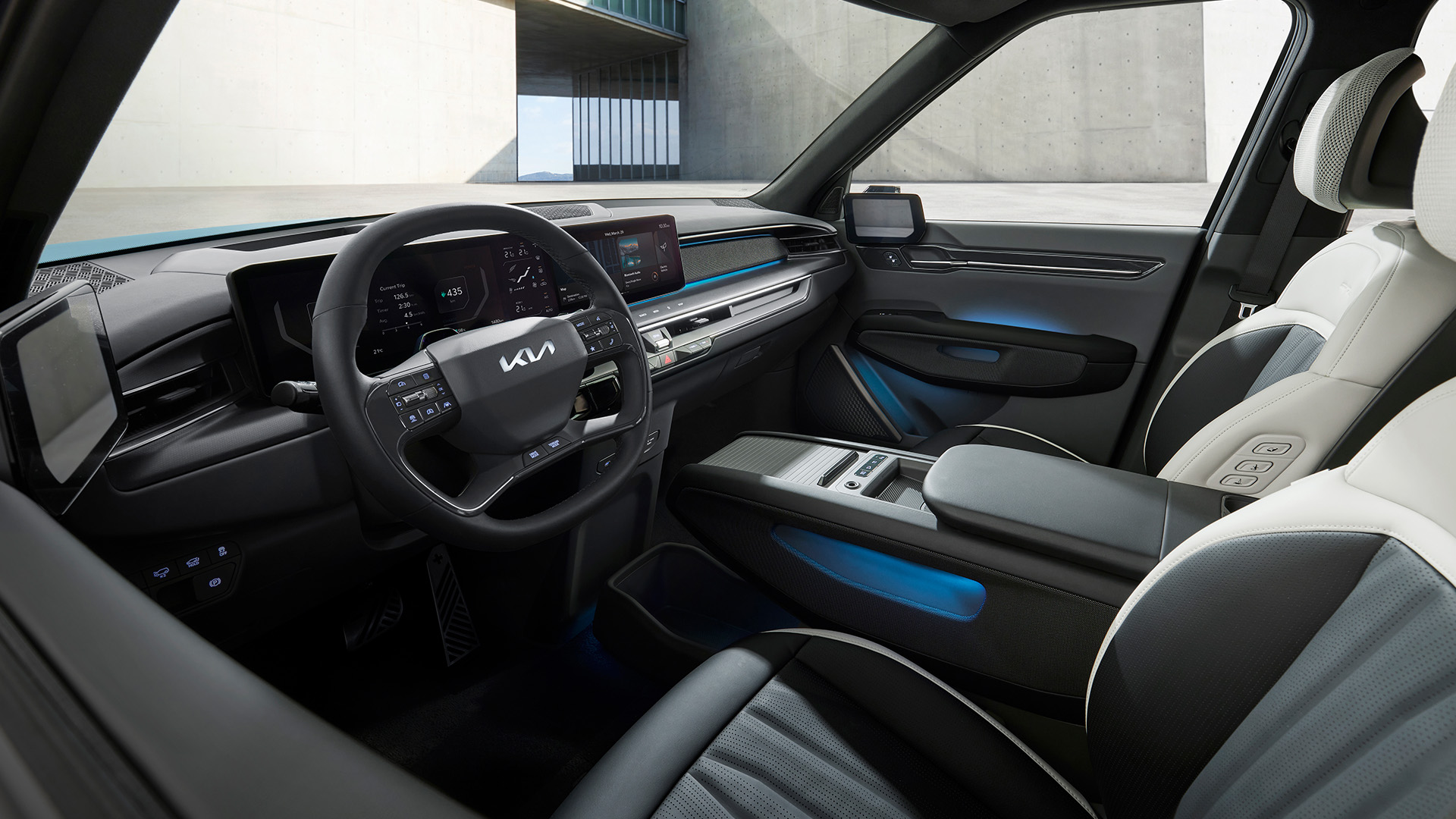 EV9은 3열로 구성되어 있으며 후드에 내장된 태양광 패널과 지속가능한 소재로 만든 인테리어를 채택하였으며 팝업 스티어링 휠과 27인치 울트라 와이드 디스플레이를 갖추었습니다.