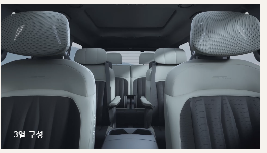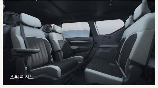 실내는 2열과 3열의 좌석을 편평하게 접을 수 있도록 설계되어있어 차박을 하시는 분들에게 적합한 차량이라고 할 수 있겠습니다. 특히 2열은 전기차 모델 최초로 180도 회전이 가능한 스위블 시트를 적용해서 3열 탑승자와 마주 앉아 이동할 수도 있습니다.
